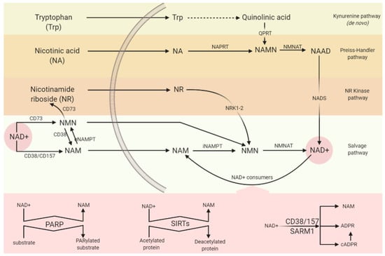 NAD+ synthesis and catabolism. There are multiple routes to sustain NAD concentrations within the cell; de novo from tryptophan (Trp), through the Preiss–Handler pathway, or via nicotinamide (NAM) or nicotinamide riboside (NR) salvage pathways. Extracellular is shown to the left of the image, intracellular to the right. NAD+ consumption is shown in pink. Legend: Nicotinamide mononucleotide (NMN); extracellular nicotinamide phosphoribosyltransferase (eNAMPT); intracellular nicotinamide phosphoribosyltransferase (iNAMPT); nicotinate phosphoribosyltransferase (NAPRT); nicotinic acid mononucleotide (NAMN); quinolinate phosphoribosyltransferase (QPRT); nicotinic acid adenine dinucleotide (NAAD); nicotinamide riboside kinase 1 and 2 (NRK1–2); NAD+ synthase (NADS); NA phosphoribosyl–transferase (NAPRT); NAM mononucleotide transferases (NMNAT); poly(ADP–ribose) polymerases (PARP); sirtuins (SIRTs); Sterile alpha and TIR motif–containing 1 (SARM1); cyclic ADP–ribose synthases (cADPR).