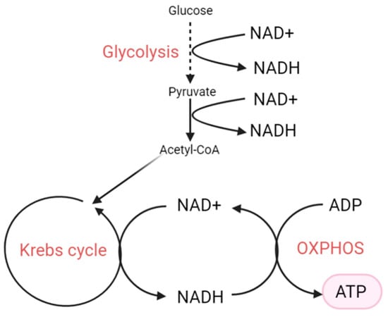NAD+ and NADH can be either free or bound to protein, with three major pools compartmentalised in the nucleus, cytosol, and mitochondria []. The NAD+/NADH ratio is a regulator of cellular energy metabolism; glycolysis and OXPHOS. It reflects the metabolic status and redox state of the cell, and it fluctuates in response to a change in metabolism []. The NAD(H)–redox state is determined by the rate at which NADH is produced and the rate at which NADH is oxidised back into NAD+. NAD+ is reduced to NADH mostly in catabolic reactions such as glycolysis and the tricarboxylic acid (TCA/Krebs) cycle (Figure 2) []. To maintain a stable redox state, NADH needs to be re–oxidised to NAD+ constantly via several pathways. The oxidised form of NAD, NAD+, is the major form. The total intracellular NAD(H) concentrations (free and bound) have been reported to be 1–3 mM [], with an [NAD+]total/[NADH]total ratio of 2–10/1 (depending on species, cell type, and metabolic state) [,,,]. However, the ratio in neuronal cell lines has been reported to be between 10 and 30 [], indicating that neurons might have significantly higher NAD+/NADH ratio than non–neuronal cells. These values suggest that NAD+ can function as a metabolic regulator of the NAD+/NADH ratio in a variety of tissues. However, Zhang et al. demonstrated that the ratio of the free pool of NAD+ to NADH is closer to 600 (measured by the pyruvate/lactate ratio) in Cos–7 cell lines []. This highlights the importance of establishing which reported NAD+/NADH number represents the real situation in the cell type of interest. Although the NAD+/NADH redox ratio has been extensively studied in other organs, a description of the NAD+/NADH redox ratio in RGCs and its involvement in in POAG, remains to be elucidated. It is likely to be very cell– and context–dependent. It is important to investigate the possible causes for a reduced NAD+/NADH ratio. In theory, a reduced ratio can result from either a depletion in NAD+ or an increase in NADH or both (see Section 5 and Section 6). The total pool size of NAD+ and NADH, is, therefore, determined by the relative rates of their biosynthesis and degradation.