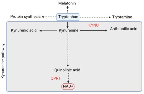 Simplified overview of the kynurenine pathway of tryptophan metabolism. Key enzymes are shown in red: kynureninase (KYNU); quinolinic acid phosphoribosyltransferase (QPRT).