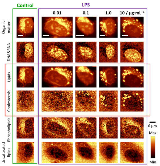 Two-dimensional Raman images were based on the analysis of characteristic bands, in particular at 785 cm−1 due to the ring breathing modes of nitrogen bases in the DNA&RNA, at 724 cm−1 due to the symmetric stretching vibrations of the choline N+(CH3)3 groups of phospholipids, and at 704 cm−1 due to the in-plane ring deformations of cholesterols. Additionally, the Raman signal in the 2900−2830 cm−1 spectral range associated with the C–H stretching vibrations, originating mostly from lipids, as well as the band in the 3030–3000 cm−1 range due to lipids containing double bonds in their hydrocarbon chains, were considered [21]. In addition, Raman images presenting the distribution of all organic compounds are shown. The obtained images enabled us to draw the following conclusions. HMEC-1 incubated with LPS form numerous LDs which composition was dominated by cholesterols (Figure 1, marked with a red rectangle). The onset of LDs formation was visible for the LPS concentration of 1.0 μg·mL−1 but starting from the 10 μg·mL−1 concentration this effect was evident for the whole measured population of cells. Unlike LDs observed after stimulation with TNF-α [11], LDs triggered by 24 h incubation with LPS did not exhibit a high degree of lipid unsaturation. In principle, there was no change in lipid unsaturation compared to the unsaturation of LDs in the control (scarce amount, vide infra). In addition, there were no significant alterations in the distribution of other biomolecules in the studied cells.