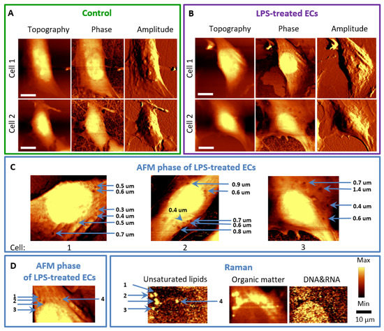 AFM and Raman imaging of endothelial cells incubated with LPS. Representative images of the topography, phase, and amplitude of control HMEC-1 cells (A) and stimulated with LPS at a concentration of 10 μg·mL−1 for 24 h (B). The arrows (C) indicate the locations of concaves in the phase images of LPS-treated cells. Phase and topography AFM image as well as Raman images showing co-localized changes in the cell membrane and inside of the cell (D).