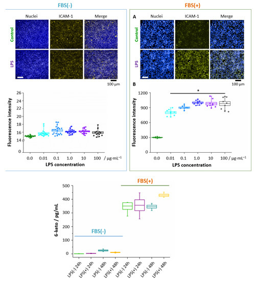 LPS-induced ICAM-1 expression and PGI2 production in endothelial cells in the presence and absence of FBS. The staining of surface ICAM-1 molecules was performed for HMEC-1 after 24 h treatment with LPS E. Coli in different concentrations. Representative fluorescence images (A) showed the overexpression of ICAM-1 (fluorescence intensity of the fluorophore (R-phycoerythrin) fused to the ICAM-1 antibody, yellow areas, nuclei – blue areas) for LPS-treated cells (10 μg·mL−1) in comparison to control cells, combined with the analysis of fluorescence intensity (B). The concentration of 6-keto PGF1α in effluent from HMEC-1 from control and LPS-stimulated (10 μg·mL−1) HMEC-1 with/without FBS supplementation (C). Values given as mean ± SEM are shown in box plots: mean (horizontal line), SEM (box), minimal and maximal values (whiskers). * p < 0.05.