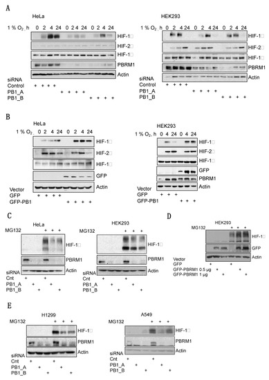 PBRM1 is required for HIF-1α protein levels independently of proteasomal degradation. (A) The HeLa and HEK293 cells were transfected for a total of 48 h with either control or PBRM1 (PB1) siRNAs before exposure to treatments with 1% O2 of different duration, +, signifies specific treatment. Whole-cell lysates were analysed by Western blotting to assess HIF isoform protein levels. (B) The HeLa and HEK293 cells were transfected with 1 µg of either the GFP empty vector or a plasmid containing GFP-PBRM1. The cells were then exposed to 1% O2 for treatments of different duration. Whole-cell lysates were analysed by Western blotting to assess HIF isoform protein levels. (C) The HeLa and HEK293 cell lines were transfected with control or PBRM1 siRNAs, then treated with DMSO or MG132 for 3 h before lysis. Whole-cell lysates were analysed by Western blotting to assess HIF-1α protein levels. (D) The HEK293 cells were transfected with 1 µg of either the GFP empty vector or increasing amounts of a plasmid containing GFP-PBRM1. The cells were then treated with DMSO or MG132 for 3 h before lysis. Whole-cell lysates were analysed by Western blotting to assess HIF-1α protein levels. (E) The H1299 and A549 cells were transfected with control or PBRM1 siRNAs, then treated with DMSO or MG132 for 3 h before lysis. Whole-cell lysates were analysed by Western blotting to assess HIF-1α protein levels.