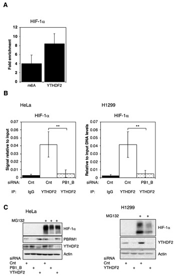HIF-1α mRNA is m6A-modified and bound by YTHDF2. (A) The HeLa cells were lysed and incubated with either m6A or YTHDF2 antibodies; then, bound HIF-1α mRNA was analysed by qPCR. (B) The HeLa and H1299 cells were then transfected with either control or PBRM1 siRNAs and incubated with the IgG control or YTHDF2 antibodies before analysis of HIF-1α mRNA levels. The means and standard deviations are plotted with Student’s t-test significance indicated (** p ≤ 0.01). (C) The HeLa or H1299 cells were transfected with control, PBRM1 or YTHDF2 siRNAs and either DMSO or MG132 for 3 h; then, the cells were lysed and protein levels were determined by Western blotting. +, signifies specific treatment.