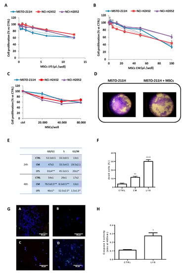 Inhibitory effect of MSCs LYS and MSCs CM on mesothelioma proliferation and co-culture assay. The activity on cell proliferation of MSCs LYS (A) and MSCs CM (B), expressed as µL/well from 3 donors of adipose tissue-derived MSCs, were evaluated after 7 days in MSTO-211H, NCI-H2452 and NCI-H2052 cell lines by an MTT assay. Each point represents the mean ± standard error (SEM) of three replicates. Linear regression was reported (dashed lines). (C) MSTO-211H, NCI-H2452 and NCI-H2052 cells were co-cultured with MSCs and after 5 days, cell proliferation was evaluated by a crystal violet assay. Data are means ± SEM of six independent replicates. Linear regression was reported (dashed line). (D) Representative images of transwell inserts with MSTO-211H cells co-cultured alone or in the presence of 8 × 104 MSCs after staining with crystal violet (400×). (E) MSTO-211H cells were treated with MSCs LYS (1:4) and MSCs CM (1:2). After 24 and 48 h, cells were stained with propidium iodide and analyzed by flow cytometry for cell cycle phase distribution. Percentage values ± SEM of two independent experiments are reported in the table (* p < 0.05, ** p < 0.01 vs. control). (F) MSTO-211H cells were treated with MSCs LYS (1:4) and MSCs CM (1:2). After 72 h, cell death was quantified by fluorescence microscopy analysis on Hoechst 33342 and propidium iodide-stained cells. Data are expressed as percentage values ± SEM of three independent experiments (** p < 0.01, **** p < 0.0001 vs. control). (G) Representative confocal images of control cells (A,C) and cells treated for 48 h with MSCs LYS 1:2 (B,D). Healthy viable cells were stained with CytoCalcein Violet 450 (blue), necrotic cells with 7-aminoactinomycin D (red), and apoptotic cells with phosphatidylserine (green). (A,B): adherent cells; (C,D): detached cells. (Objective 100×). (H) Caspase-3 activity measurement after 48 h of treatment. The histogram represents absorbance (abs) at 405 nm. Data are expressed as means ± SEM of three replicates. * p<0.05 vs. control.