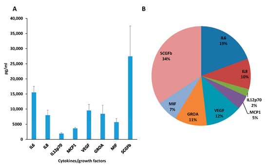 MSCs secretome analysis. (A) The histogram reports eight cytokines/growth factors measured in MSC-conditioned media (expressed in pg/mL). Each point represents the mean ± standard error (SEM) of the determinations performed on nine different MSCs donors. (B) Cytokines/growth factors expressed as percentage calculated on the total amount of the eight molecules.