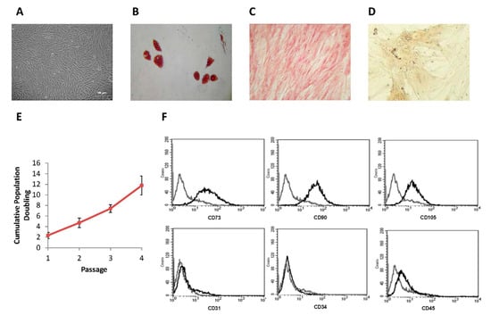 MSC characterization. (A): Spindle-shaped MSCs morphology (magnification 5×). (B): Adipogenic differentiation evaluated by Oil Red staining (presence of red cytoplasmic inclusions); (C): Osteogenic differentiation evaluated by Alizarin Red S staining; (D): Chondrogenic differentiation evaluated by micro-mass methods. (All at 200× magnification). (E): Number of cumulative population doubling with respect to cellular passage. Each point represents the mean ± SEM of 14 replicates. (F): Phenotypic characterization by FACS of a representative sample of MSCs.