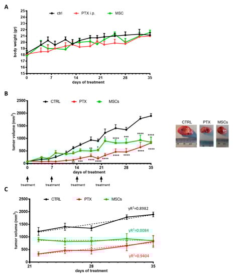 Effects of MSCs in MSTO-211H xenograft model. (A) MSTO-211H cells were subcutaneously inoculated into BALB/C nude mice, and after tumors had reached an average size of approximately 100 mm3, the animals were treated once a week (at days 0, 7, 14 and 21) with vehicle alone (CTRL), paclitaxel (20 mg/kg) or MSCs (5 × 106). (A) Mice body weight was monitored for the entire duration of the treatment. (B) Tumor volumes were measured twice per week and data are expressed as means of ± SEM. * p < 0.05, ** p < 0.01, *** p < 0.001, **** p < 0.0001 vs. CTRL. Representative images of dissected xenograft tumors are shown. (C) The graph shows the tumor growth during the 14 days after stopping treatments (from 22 to 35 days). Data are expressed as means ± SEM and for each group, the linear regression (dashed line) with R2 value is reported.