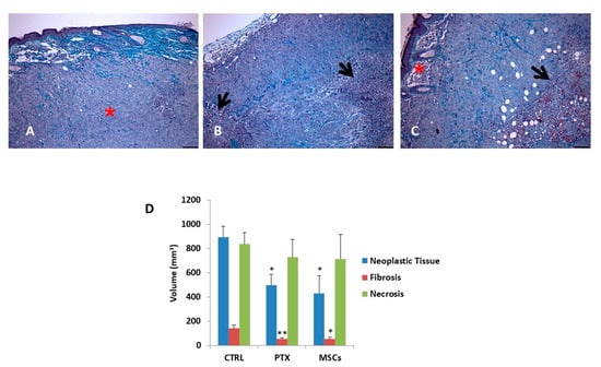 Morphometric analysis of tumor xenografts. Selected sections from MSTO-211H xenografts untreated (CTRL, A), treated with paclitaxel (PTX) (B) or with MSCs (C) stained by Masson’s Trichrome to distinguish the fibrotic tissue (greenish) from neoplastic cells (purple). Black arrows in B and C point to necrotic areas, some of which show pigmented (reddish) debris. Red asterisks in A and C indicate skin and adnexa. Scale bars = 100 µm. (D) Bar graph showing the quantitative evaluation of tissue composition (neoplastic tissue, fibrosis and necrosis) in tumor xenografts. Data are expressed as means ± SEM. * p < 0.05, ** p < 0.02 vs. control group.