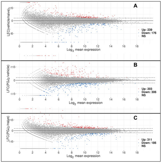 MA plots comparing differences between two samples and mean expression. Plots display the relationship between log-fold expression change (LFC: M) between the two samples and average expression. Log2 mean expression: (A) Comparison between mean naïve and 3d post-rAION-induced, vehicle-treated ONH. (B) Comparison between rAION-induced animals treated with PGJ2 and vehicle. (C) Comparison between naïve and PGJ2-rAION-induced animals. Individual genes are shown in Supplemental Table S1. False discovery rate (FDR) was set at ≤0.05 and log2-fold change (LFC; on ordinate scale) ≥ +/1). Log2 mean expressions for the genes are shown on the abscissa. Dashed lines indicate the LFC cutoff values of +/1. Points in gray indicate those genes that are not significantly expressed. Points colored in red indicate the upregulated genes, while points in blue indicate the downregulated genes.
