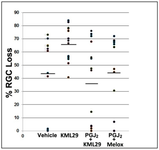 Isolated PGJ2 treatment has been shown to reduce ONH edema post-rAION and improve RGC survival [27,28,29]. RGC stereological quantification 30 post-rAION induction revealed that vehicle administration alone resulted in an RGC loss of 44.0 ± 9% sem (Figure 5, vehicle), while treatment with KML29 alone actually increased RGC loss (66.6 ± 3.7% sem) (Figure 5, KML29). This difference was significant (two-tailed t-test; p = 0.0275). In contrast, co-administration of PGJ2 with the MAGL inhibitor KML29 generated a nonsignificant decrease in RGC loss compared with vehicle (36.6 ± 7.9% sem) (Figure 5, PGJ2 + KML29), and PGJ2 + meloxicam yielded RGC losses comparable with vehicle alone (44.6 ± 9.0% sem) (Figure 5, PGJ2 + Melox). Thus, isolated KML29 administration actually increased RGC loss, while the combination of either KML29 or meloxicam and PGJ2 did not significantly reduce RGC loss below that of vehicle alone.