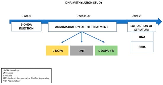 Schematic representation of the experimental workflow. Rats received a unilateral injection of 6-OHDA at PND 21 followed by a 2-weeks sub-chronic treatment (from PND 35 to PND 49) according to their respective group (L-DOPA, UNT, L-DOPA + Riluzole). The rats received one final treatment at PND 53; striata were collected and analyzed for changes in methylation levels.