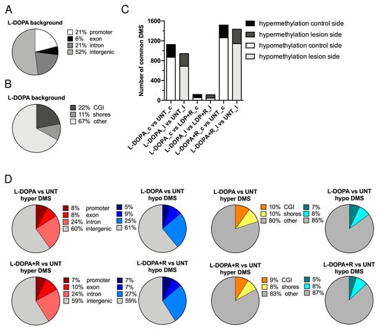 Distribution of CpGs detected by RRBS in the rat genome. (A) Distribution of CpGs in the genome (promoter, exon, intron, intergenic) (B) Distribution of CpGs in areas of different CG density (CpG island, CpG shores, other). (C) Number of differentially methylated sites (DMSs) in the experimental groups (L-DOPA vs. UNT control side, L-DOPA vs. UNT lesioned side, L-DOPA vs. L-DOPA + R control side, L-DOPA vs. L-DOPA + R lesioned side, L-DOPA + R vs. UNT control side, and L-DOPA + R vs. UNT lesioned side) classified as hyper- or hypomethylated. (D) Genomic distribution of CpG methylation changes. Distribution of hypermethylated and hypomethylated CpGs in L-DOPA treated vs. UNT rats. Distribution of hypermethylated and hypomethylated CpGs in L-DOPA + Riluzole treated vs. UNT rats.
