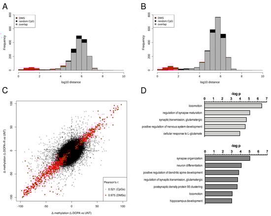 Characterization of DMS. (A,B) Distribution of genomic distances between neighboring DMS in L-DOPA vs. UNT and L-DOPA + R vs. UNT groups shown in red. The average of 100 random distributions of genomic distances of the same number of CpGs is shown in black. The overlap is shown in grey. The small difference in the shape of the random distributions between the two panels is due to the higher number of DMS in the L-DOPA + R vs. UNT comparison leading to shorter average distances between two random CpGs. (C) Scatter plot of CpGs present in both L-DOPA vs. UNT and L-DOPA + R vs. UNT comparisons. The plot shows the methylation changes in the treated animals of each CpG relative to the UNT animals. The red dots indicate CpGs, which are DMS in both comparisons. Pearson’s R values are also shown in grey and red. (D) shows the results of the GO term enriched analysis performed using DMS detected in L-DOPA vs. UNT (upper panel) and L-DOPA + R vs. UNT (lower panel) comparisons.