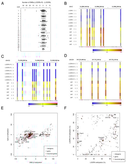 Comparison of DMS from L-DOPA vs. UNT and L-DOPA + R vs. UNT. (A) Difference of the number of DMS/bin of 1 Mb between L-DOPA + R vs. UNT and L-DOPA vs. UNT comparisons. Each dot corresponds to one bin. Black and grey colors alternate throughout the different chromosomes, numbered on the left side of the panel. (B–D) Methylation of selected genomic regions from bins indicated by red dots on panel (A) (B: Chr1: 5S rRNA, C: Chr11: Pigx, and D: Chr14: Commd1 genes) (E) Plot of methylation changes are shown for DMS from either L-DOPA + R vs. UNT or L-DOPA vs. UNT comparisons. Only DMS from CpGs analyzed in both comparisons are shown if the methylation difference between L-DOPA and L-DOPA + R samples is at least 20%. Red dots indicate DMS of genes with relevance to LID. Grey circles indicate intergenic DMS. (F) DMS of L-DOPA vs. L-DOPA + R comparison. DMS of genes with relevance are indicated in red.