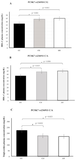 Genetic contribution of the PCSK7 rs236911 C/A, PCSK7 rs236918 C/G, and PCSK7 rs508487 T/C polymorphisms on plasma lipid concentrations. (A) The rs236918 CC genotype showed low HDL-C levels when compared to the CG/GG genotypes (p = 0.041 and 0.015, respectively). (B) The rs236911 CC genotype showed low HDL-C levels when compared to the CA (p = 0.025) and AA (p = 0.004) genotypes. (C). In addition, the rs236911 CC genotype showed higher triglyceride levels when compared to the CA (p = 0.032) and AA (p = 0.023) genotypes.