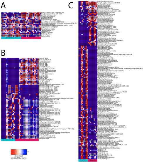 Differential abundance summary. Heatmaps showing normalized microbe abundance for COVID-19 samples vs. normal samples for (A) PBMC, (B) BALF, and (C) lung biopsy.