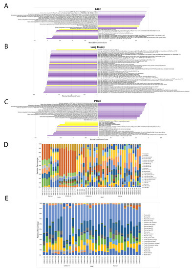 Immune landscape background. Bar plots showing nominal enrichment score for GSEA pathways significantly correlated to COVID-19 status for (A) BALF, (B) lung biopsy, and (C) PBMC samples. Stacked bar plots showing relative immune cell abundances for (D) BALF, lung biopsy, and (E) PBMC samples.