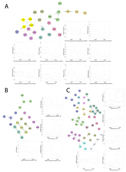 Select gene networks. Gene networks of GSEA pathways each correlated to three microbes with boxplots of microbe abundance vs. IA gene expression for microbes significantly correlated to IA gene expression for genes found to be enriched within the respective gene network. The gene networks were produced using the Cytoscape Reactome FI software. All boxplots were produced using the Kruskal-Wallis test. The networks are for the immunological signatures (A) GSE17974_CTRL_VS_ACT_IL4_AND_ANTI_IL12_72H_CD4_TCELL_DN, (B) GSE4590_SMALL_VS_LARGE_PRE_BCELL_UP, and (C) GSE3565_DUSP1_VS_WT_SPLENOCYTES_UP.