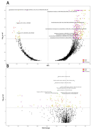 3.5. Microbes from BALF Samples Correlate to Immune Infiltration and to Dysregulation of Immunological Signatures and Canonical Pathways