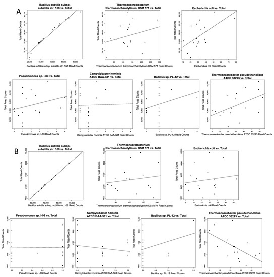 Contamination correction. Spearman’s correlation for select disease severity associated microbes. Scatterplots showing microbe abundance vs. total microbial reads for the most significantly differentially abundant microbes from (A) PBMC COVID-19 samples and (B) PBMC normal samples.