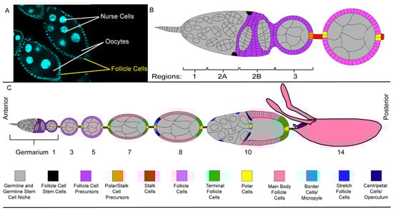During early oogenesis, the NCs undergo several rounds of endocycling in which they replicate their DNA, but do not divide []. These 10–12 rounds of endocycling produce large NCs with large polyploid nuclei, while the oocyte nucleus remains small and dormant []. Thus, with a simple DNA stain, the oocyte can easily be identified in the cyst predominantly made up of NCs (Figure 2A). The oocyte and NCs, however, are not the only cells embarking on the journey of oogenesis.