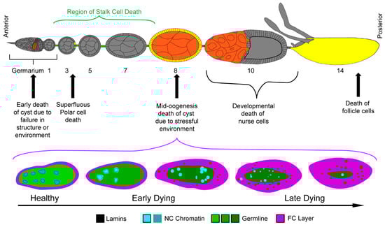 The first form of somatic cell death takes place throughout early and mid-oogenesis []. From stages 2 through 8, apoptotic death has been detected in stalk cells. As they leave the germarium, egg chambers have too many stalk cells which, if they persist, have been shown to reduce fecundity. Egg chambers that lack stalk cells have been shown to merge with adjacent egg chambers. To achieve the optimal egg chamber production, stalk cells are overproduced early and die as development progresses [].