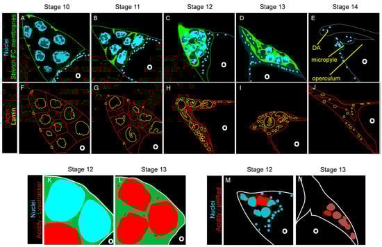 Nuclear compression is regulated by actin [,,]. During stage 10, actin bundles form at the NC periphery and extend to the NC nuclei. As cytoplasmic dumping commences, the actin bundles push the NC nuclei up and away from the ring canals, thus preventing the formation of blockages []. As the actin continues to extend, it compresses the NC nuclei, forming gaps in the chromatin []. The structure of these gaps can be further visualized by examination of nuclear lamins (Figure 4F–J). Throughout developmental death, the nuclear lamina become increasingly folded resulting in the formation of crenellations at stage 10, then deeper involutions by stage 12, and finally the lamina becomes discontinuous and degrades in stage 13. Lamina degradation heralds the final destruction of the nucleus [].
