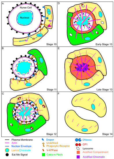 In one study, Dcp-1, Diap1, Atg7, and Atg1 were used to investigate the role of apoptosis and autophagy in NC death []. Surprisingly, when both pathways were blocked, less than half of all stage 14 egg chambers contained any PN. Additionally, in egg chambers that contained PN, most only contained 1–3 PN, thus 12–14 nuclei were still cleared. Together, these data suggest that apoptosis and autophagy are not major participants in NC death and clearance [].