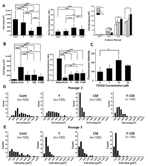 Morphological analysis of rCECs at passage numbers 2 and 5. (A) Cell size and nuclei-cytoplasmic ratio (n = 20), and cell number change during 10-day culture with AlamarBlue assay of passage number 2. (B) Cell size, nuclear-cytoplasmic ratio (n = 20) of native tissue and passage 5. (C) Optimization of Y-27632 concentration with rCEC passage 2. (D,E) Cell size distribution of passage 2 and passage 5 cultured for seven days (n = 105). (mean ± SD, * p < 0.05, ** p < 0.01, *** p < 0.001).