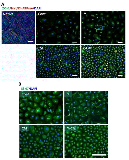 The staining of the tight junction marker ZO-1 was dispersed on the plasma membranes, not localized in the cell–cell contact region in all groups both P2 and P5. Na+/K+ -ATPase marker, an indicator of pump function, was expressed in only a few cells in the CM and Y-CM groups when cultured on a culture plate (Figure 2A). Immunofluorescence images showed substantially higher expression of the proliferation marker Ki-67 in the CM and Y-CM groups than the Cont and Y groups (Figure 2B). Cell apoptosis marker caspase-3 had no significant expression in all groups at P2 (Supplementary Figure S1).