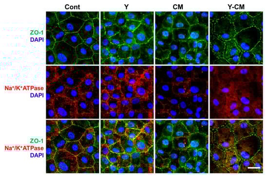 rCECs cultured on collagen film exhibited ZO-1 and Na+/K+-ATPase in all groups, which is different from cells cultured in the well plates (Figure 3). Cells on collagen film showed different ZO-1 and Na+/K+-ATPase distribution. Cont shows clear ZO-1 lines, and Y-CM has immature lines along the cell–cell contact boundaries. This may be explained by the inverse correlation between ZO-1 expression and cell cycling. In Cont group, overexpression of ZO-1 reduces a cell cycle-related proprotein nuclear CDK4 (cyclin-dependent kinase 4) [22], which results in suppression of cell mitosis and cell proliferation. Furthermore, phase separation of ZO proteins derives tight junction formation [23]. Consequently, when ZO-1 is in high concentrations in a cell, cell cycle is arrested, ZO-1 is phase separated, and tight junction forms (Cont). Cells with an underdeveloped tight junction may have low ZO-1 level, and active and proliferative cell cycles (Y-CM). Similar results were observed with corneal endothelial cells cultured on the collagen–vitrigel membrane [24,25].