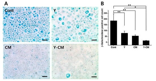 The senescence marker SA-β-gal activity was stronger in the Cont and Y groups than in the CM and Y-CM groups (Figure 4A). The number of SA-β-gal-positive cells was significantly lower in the CM and Y-CM groups compared to that observed in the control group (Figure 4B).