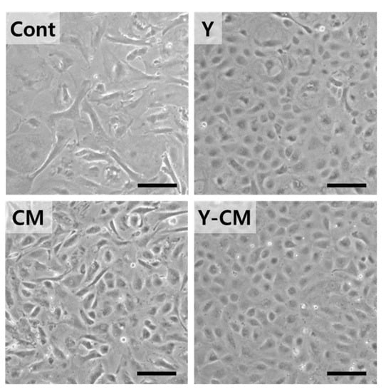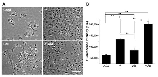 When cells cultured up to passage 7 with Y-CM were seeded for passage 8, the culture media was rearranged with four different media for Cont, Y, CM, and Y-CM. On day one after incubation, cells cultured in Cont and CM media exhibited very poor adherence to the substrates. Cells in Y and Y-CM had similar cell morphology to the cells of P7 in Y-CM (Figure 6A). The AlamarBlue assay revealed that the fluorescence intensity of Y and Y-CM were more than two times that of Cont and CM (Figure 6B).