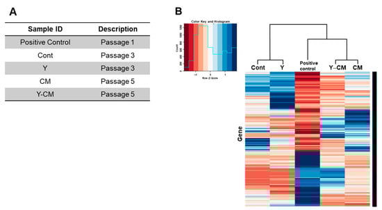 Figure 7A denotes the passage number of rCECs for RNA sequencing for each cell culture medium group. Clustergram analysis of gene expression in Figure 7B shows a similarity between the positive control and Y-CM groups compared to the other groups.