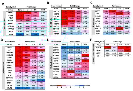 Gene expression of cell proliferation, cell cycle, senescence, apoptosis, cell adhesion, and CEC markers is summarized in Figure 8. Among cell proliferation genes, MKI67, CIP2A, PCNA and MTCP1 genes were different between positive control and Y-CM groups. MKI67 is significantly decreased in the Cont (−5.471), Y (−4.348), and CM (−1.300) groups, whereas the Y-CM group shows minor changes (−0.003) with respect to P1-positive control rCECs (Figure 8A).