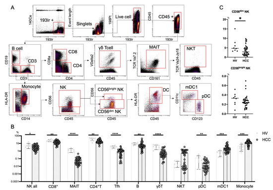 Frequencies of immune cells in HCC patients. (A) Mass cytometry gating scheme used to identify the peripheral blood immune cell subsets investigated here. Arrows indicate the gating sequence. (B) Summary of the frequency frequencies of the indicated immune cell populations isolated from healthy volunteers (HVs) (n = 8) and HCC patients (n = 39). (C) Percentages of CD56dim NK cells and CD56bright NK cells among total peripheral blood mononuclear cells from HVs (n = 8) and HCC patients (n = 39). Data are presented as means ± SD (B,C). * p < 0.05; ** p < 0.01; *** p < 0.001; **** p < 0.0001 by the Mann–Whitney U-test (B,C).