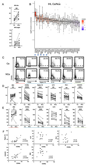 Next, we compared expression patterns of 32 surface markers between Ca-CD56dim NK cells and NCa-CD56dim NK cells using Panel 2 in HCC patients (n = 16) (Tables S4 and S5). Figure 3B shows the log fold changes of MSI in Ca-CD56dim NK cells with respect to that in NCa-CD56dim NK cells. 2B4 expression was reduced in Ca-CD56dim NK cells (3B-3E). Conversely, CD49a was highly expressed in Ca-CD56dim NK cells as reported previously (3B-3E) [22]. In addition to CD49a, we found that the expression levels and frequencies of Siglec-10, ILT2, PD-1, and CX3CR1 were significantly increased in Ca-CD56dim NK cells (3B-3E). The percentages of CD49a+Ca-CD56dim NK cells correlated positively to those of Siglec-10+ and CX3CR1+ Ca-CD56dim NK cells, but not ILT2+ or PD-1+ Ca-CD56dim NK cells (Figure 3F), which suggested that CD49a, Siglec-10, and CX3CR1 were co-expressed in HCC tissues. NK cells express chemokine receptors CCR1, CCR2, CCR5, CXCR3, CXCR4, and CX3CR1, and migrate to inflamed sites and the tumor microenvironment [26]. Therefore, CX3CR1+NK cells might accumulate in the tumor microenvironment because CX3CL1 (Fractalkine), which is the ligand for CX3CR1, is produced by HCC cells [27].