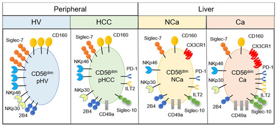Summary of phenotypic alterations in peripheral and intrahepatic CD56dim NK cells from HCC patients. CD56dim, CD56dim NK cells; pHV, in the peripheral blood of healthy volunteers; pHCC, in the peripheral blood of HCC patients; NCa, from noncancerous adjacent liver tissues; Ca, in HCC tissues.