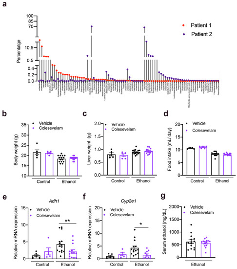 The 16S rRNA analysis of stool from the two patients with alcoholic hepatitis is shown in Figure 2a. Colesevelam treatment did not affect body or liver weight in control or ethanol-fed groups. Daily food intake was similar in pair-fed mice administered colesevelam and fed a control or ethanol-containing diet (Figure 2b–d). Although colesevelam reduced hepatic expression of two enzymes that metabolize ethanol in the liver of ethanol-fed mice, alcohol dehydrogenase 1 (Adh1) and cytochrome P450 family 2 subfamily e polypeptide 1 (Cyp2e1), this did not significantly change the serum level of ethanol (Figure 2e–g).