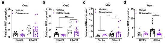 Hepatic expression of inflammatory cytokines and chemokines, including chemokine (C-X-C motif) ligand 1 (Cxcl1), Cxcl2, and chemokine C-C motif ligand 2 (Ccl2), was not significantly different in mice treated with colesevelam following chronic ethanol feeding (Figure 4a–c). However, myeloperoxidase (Mpo), marker of neutrophil azurophilic granules, was significantly decreased after treatment with colesevelam (Figure 4d).