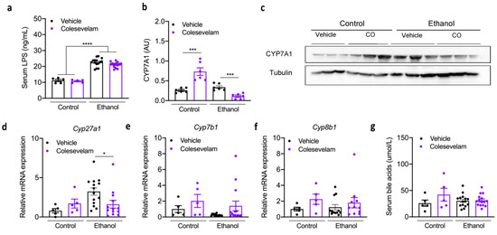 Colesevelam reduced the hepatic expression of Cyp7a1 protein (Figure 5b-c) and Cyp27a1 mRNA expression (Figure 5d), while hepatic Cyp7b1 and Cyp8b1 mRNA expression were unchanged in mice fed chronic-binge ethanol diet (Figure 5e-f). The serum levels of bile acids were similar in ethanol-fed mice treated with vehicle or colesevelam (Figure 5g).