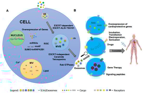 A summary of (A) EV cargo sorting and (B) methods for engineering exosome-based therapeutics to treat cardiovascular disease. EV cargo sorting is dependent on recognition signal or motif, post-translational modifications, and signaling molecules via ESCRT-dependent or -independent mechanism. Current methods in engineering EVs to incorporate therapeutic molecules include viral (e.g., overexpression of a gene using a viral vector, and delivery of a gene using a recombinant virus) or non-viral (e.g., incorporation of drugs or bioactive compounds by incubation or mechanical means, and alteration of targeting peptides) approaches. Abbreviations: Extracellular Vesicle (EV), Endosomal Sorting Complex (ESCRT), Early Endosome (EE), Multivesicle (MV), Multivesicular body (MVB).