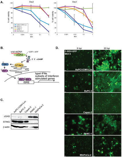 Susceptibility to C-REV on human pancreatic cancer cell lines. (A) Cytotoxicity of C-REV with several MOI against the indicated human pancreatic cancer cell lines on day 2 and day 3 by MTT assay. Data are presented as mean ± SEM of 3 independent experiments. (B) A brief illustration of the STING pathway. (C) Western blot analysis on STING and cGAS. (D) Images of the indicated cells infected with C-REV-GFP (MOI 5) at 6 hpi or 20 hpi. Scale bar represents 20 µm.