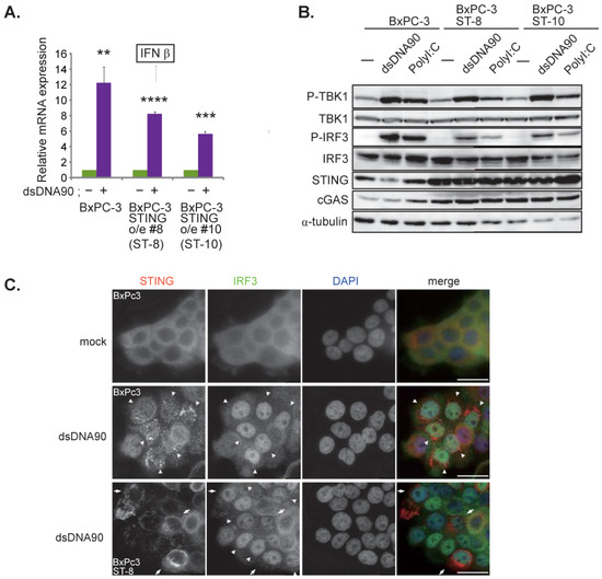 BxPC-3 cell line has a responsive STING pathway. (A) Induction of IFNβ. At 6 h after transfection of dsDNA90 (3 μg/mL) into BxPC-3, BxPC-3 ST-8 and BxPC-3 ST-10 cells, samples were analyzed by RT-qPCR. IFNβ expression was normalized relative to the expression of the G3PDH protein. Data are presented as mean ± SEM of 3 independent experiments. (B) Western blot analysis on the indicated proteins on the STING pathway. Cells were lysed after 6 h after transfection with dsDNA90 (3 μg/mL) or Poly (I:C) (3 μg/mL). (C) Images of the indicated cells at 6 h after transfection with dsDNA90 (3 μg/mL). Cells were stained with anti IRF3 antibodies and anti-STING antibodies. Arrowheads depict cells with stacked STING and with intranuclear translocation of IRF3. Arrows depict cells with over expression of STING. Scale bar represents 20 µm. ** p < 0.01, *** p < 0.001, **** p < 0.0001.