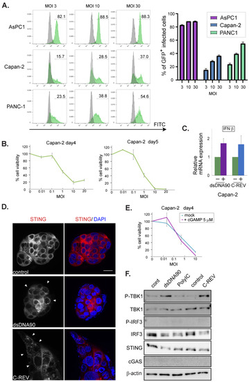 The oncolytic virus has a huge potential to evoke strong antitumor immune responses; however, its efficacy is highly dependent on its cytotoxic effects and its replication efficiency on tumor cells. To evaluate the cytotoxic effects of C-REV on several types of human pancreatic adenocarcinoma cell lines, cells were infected with C-REV at several multiplicity of infection (MOI) and the cell viability was measured by MTT assay on day 2 and day 3 (Figure 1A). AsPC-1 and BxPC-3 cells depicted high susceptibility to C-REV, as these cells were drastically eliminated even at a relatively low MOI of 0.1 and 0.01 on day 3. In contrast, PANC-1, MiaPaCa-2 and Capan-2 cells showed low susceptibility to C-REV. It is probable that such differences in susceptibility can be attributed to different degrees of differentiation among the cell lines. Several studies, however, have reported that, except for Capan-2 cells, all the other cell lines have an undifferentiated status, a key feature of advanced PDAC tumor cells [32,33]. Several studies have also proposed that a common feature among advanced tumor cells is a highly defective STING pathway [23,24]. From this, we hypothesized that the different susceptibility to C-REV infection among cell lines can be attributed to the different degrees of defects in the STING pathway among cell lines (Figure 1B). To estimate the intactness of the STING pathway, STING and cGAS protein expressions of each cell line were examined (Figure 1C). AsPC1, BxPc-3 and Capan-2 expressed relatively abundant STING proteins but did not express cGAS highly. In contrast, PANC-1 and MiaPaCa-2 showed relatively high expression of cGAS but did not exhibit STING expression. Based on the expression pattern of these two STING components, all the cell lines seemed to be defective in the STING pathway, although in varying degrees. Next, to test the possibility that cells have different degrees of permissiveness for viral entry, cells were infected with C-REV-GFP viruses at MOI of 5. After 6 h post infection (hpi), except for Capan-2, all cell lines displayed similar percentages of GFP positive cells. Similarly, at 20 hpi, most of the cells were already GFP positive in all the cell lines, but only a few cells were GFP positive in Capan-2 (Figure 1D).