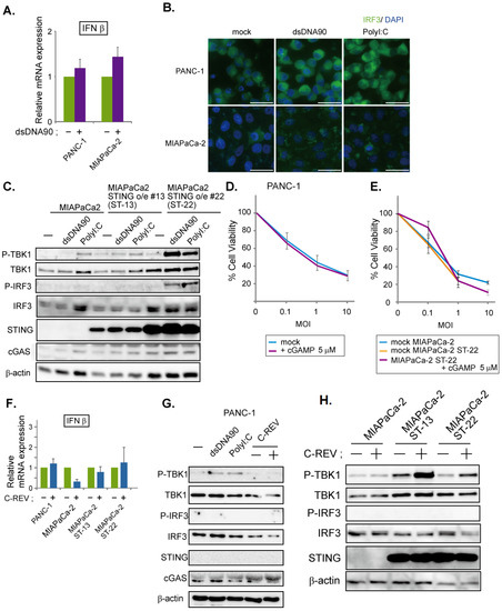 Lastly, we examined PANC-1 cells and MiaPaCa-2 cells. Since these two cell lines express limited STING proteins, we speculated that their STING pathway would be defective. To test this, the induction of IFNβ was analyzed in both cell lines upon addition of dsDNA90. As expected, little induction was observed (Figure 5A), compared to a clear induction in BxPC3 cells (Figure 2A). In addition, immunofluorescent staining of IRF3 showed that stimulation with either dsDNA90 or PolyI:C had little effect on IRF3 localization (Figure 5B). Finally, the lack of phosphorylated IRF3 in the western blotting results confirmed the defects in the STING pathway in these two cell lines (Figure 5C,G). Because MiaPaCa-2 cells exhibited notable cGAS expression, despite their lack of STING expression, we assumed that overexpression of STING might restore the STING pathway. Thus, we generated two cell lines; one of the two showed a moderate expression of STING, while the other showed an intensive expression of STING (Figure 5C). Using these cell lines, we examined the activation status of the STING pathway after stimulation with dsDNA90 or PolyI:C (Figure 5C). Compared to a clear induction in BxPC3 cells (Figure 2A), interestingly, only cells with an intensive expression of STING were able to activate the STING pathway (Figure 5C). Because dsDNA90 or PolyI:C were introduced into cells by transfection, the results might just reflect the low transfection efficiency toward the MiaPaCa-2 cells. To check this possibility, 2′3′-cGAMP treated and nontreated cells were examined by MTT assay. Little difference was observed between PANC-1 cells treated with or without 2′3′-cGAMP (Figure 5D). Similarly, little difference was observed among parental MiaPaCa-2 cells with mock treatment, MiaPaCa-2 STING over expressing cells with mock treatment and cells with 2′3′-cGAMP treatment (Figure 5E). These data suggest that susceptibility to C-REV in PANC-1 cells or MiaPaCa-2 cells is not highly dependent on STING pathway activation. Finally, we examined the effects of C-REV infection on the STING pathway in PANC-1 cells and MiaPaCa-2 cells. C-REV infection did not induce IFNβ expression (Figure 5F). Accordingly, no activation of the STING pathway was detected in PANC-1 cells nor MiaPaCa-2 cells (Figure 5G,H). Although MiaPaCa-2 cells with over expression of STING showed an increasing amount of phosphorylated TBK1, no phosphorylation of IRF3 was observed (Figure 5H). Taken together, our results suggest that C-REV infection had little effect on IFNβ induction via STING pathway activation in PANC-1 cells and MiaPaCa-2 cells.