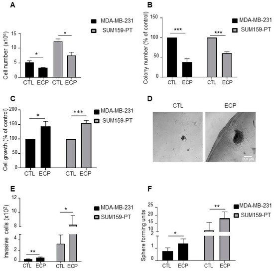 Cancer stem cells (CSCs) are known to be involved in both therapy resistance and metastasis [23,24]. To investigate whether persistent cells were enriched in CSCs, we performed the golden standard in vitro functional assay, i.e., sphere forming capacity, to analyze the ability of cancer stem cells to propagate under anchorage-independent condition in defined medium (Figure 1F). An increase of sphere forming units was observed in MDA-MB-231 and SUM159-PT persistent cells compared to control cells, suggesting an enrichment of CSCs in cells surviving ECP treatment.