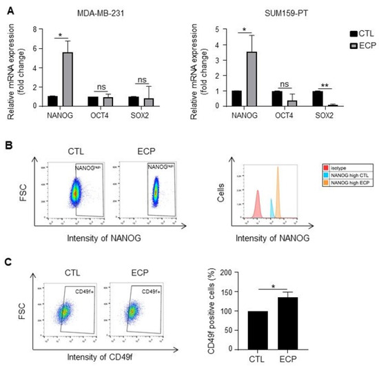 Expression of cancer stem cell markers in TNBC cells. Analyses were performed four days after ECP treatment. (A) Real-time PCR analysis of mRNA levels of pluripotency factors NANOG, OCT4 and SOX2 in MDA-MB-231 and SUM159-PT cells. RPLP0 mRNA was used to normalize variability in template loading. Data from control cells were set as 1, relative mRNA expression was evaluated by fold-change. (B,C) Flow cytometry analysis of cancer stem cell markers NANOG and CD49f in MDA-MB-231 cells. Cells were incubated with antibodies against NANOG and CD49f, and then analyzed by flow cytometry with FITC or APC filter, respectively. Isotype antibodies were used as controls. (B) Flow cytometry analysis of NANOGhigh population. Cells with fluorescence intensity ≥ log 102 were considered as NANOGhigh. Data were representative of 3 independent experiences (C) Flow cytometry analysis of CD49f positive sub-population. Quantitative graphics correspond to 3 independent experiments and illustrations are representative of 3 independent experiments. ns, not significant; *, p < 0.05; **, p < 0.01. Unpaired Student t-test.
