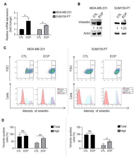 Vimentin expression in TNBC cells. Analyses were performed four days after ECP treatment. (A) Real-time PCR analysis of mRNA levels of vimentin. RPLP0 mRNA was used to normalize variability in template loading. Data from control cells were set as 1, relative mRNA expression was evaluated by fold-change. (B) Western blot analysis of vimentin. Actin was used as loading control. (C) Flow cytometry analysis of vimentinhigh sub-population. Cells were incubated with an antibody against vimentin and analyzed by flow cytometry with APC filter. Isotype antibody was used as control. Cells with APC fluorescence intensity ≥ log 103 were considered as vimentinhigh. (D) Quantification of vimentin positive and vimentinhigh sub-population in MDA-MB-231 cells (left panel) or SUM159-PT (right panel) cells. Quantitative graphics correspond to 3 independent experiments and illustrations are representative of 3 independent experiments. ns, not significant; *, p < 0.05; **, p < 0.01. Unpaired Student t-test.